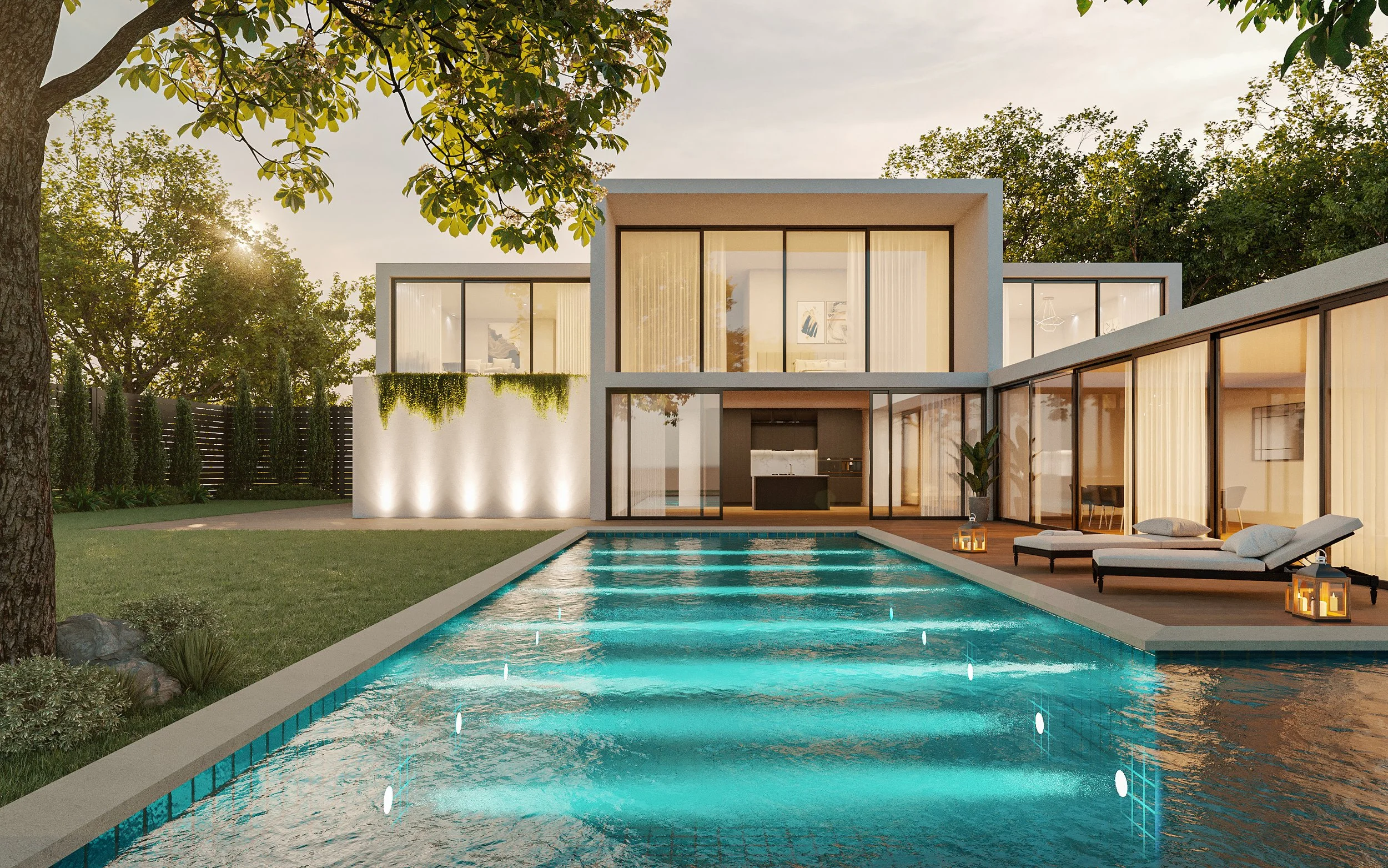 Modern white house with large arched windows, outdoor pool, and patio area with seating and lush greenery